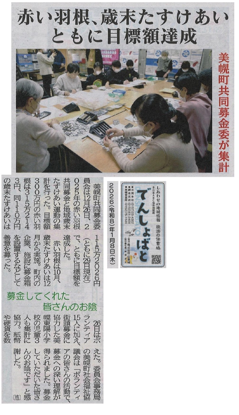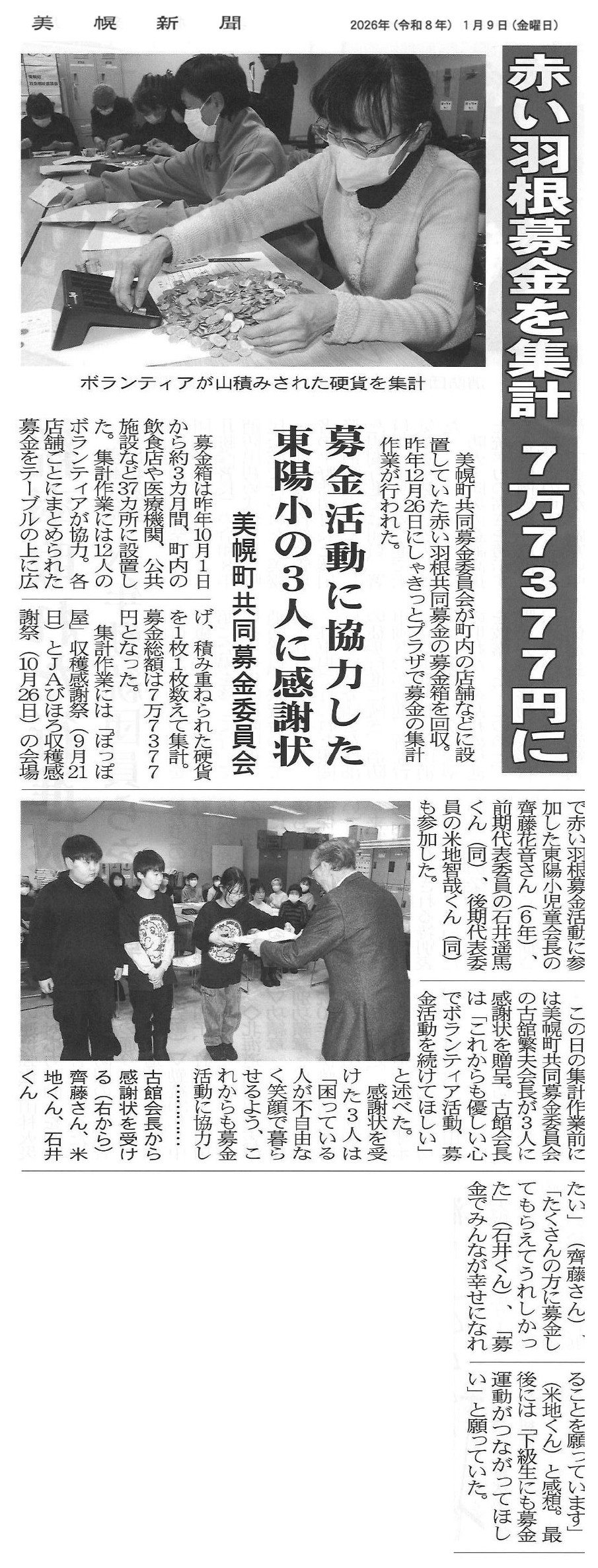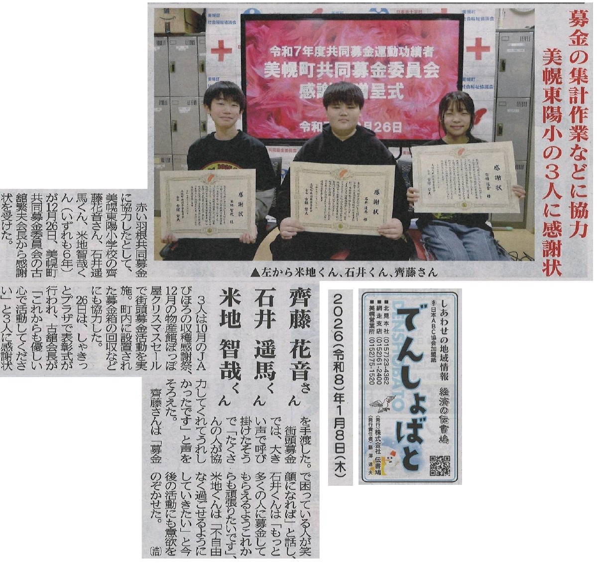 共同募金委員会「ボランティアによる募金箱集計」「小学生3名への感謝状贈呈」が美幌新聞、経済の伝書鳩に掲載されました