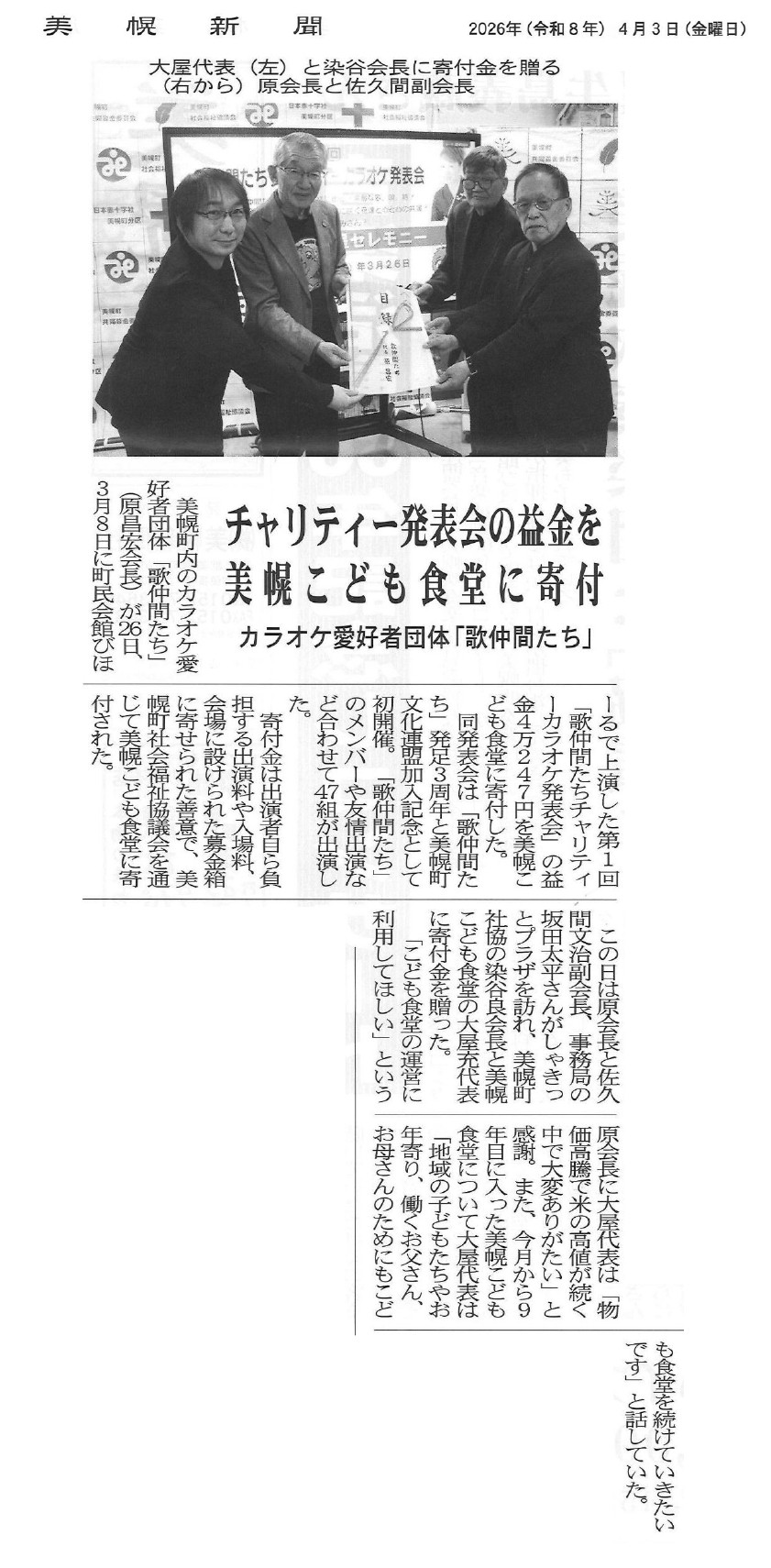「歌仲間たち」よりチャリティーカラオケ益金の寄附~美幌子ども食堂へ